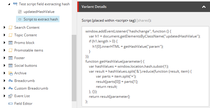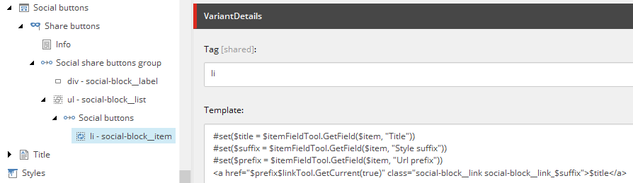 The payload, however, is lack of ability to edit anchor tag, as I mentioned in Note 5 above. But, that should not surprise, given that you see that it is being calculated on a fly from different sources. GetFieldTool reads field value of a context item, where context has been changed twice already, in this case, a variant is iterating through the list of Social buttons and $item relates to Social button item.
