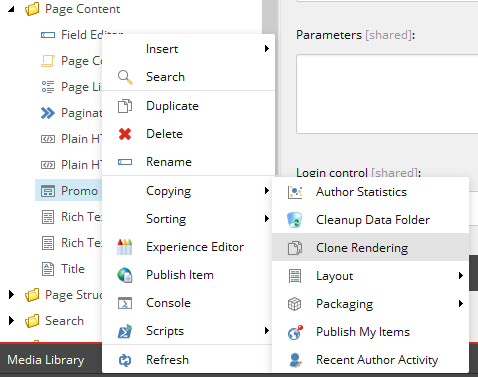 Implementation. Based on that, I decided to implement my own Share buttons component. Of course, unwilling to create a new component from a scratch, I decided to take a look on existing with a purpose of cloning it. There were 2 requirements while picking the right component to clone: 1) it should support rendering variants and 2) it should work with datasource template, so that those are also cloned. It looks that Promo component fits the purpose well, so here we go, by using an SXA built-in clone script available from a context menu: