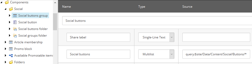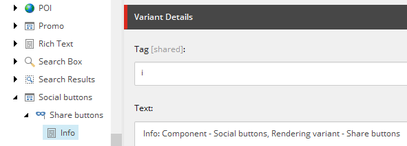 Note 4: the way rendering variants work it the first Variant Definition in the list becomes default one, if not set explicitly. I called variant Share buttons and added Info field so that it becomes visible on partial design in Experience Editor straight away (I explain Info field trick in more details in this article).