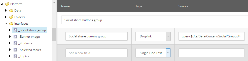 From this moment, adding _Social share groups interface template into an inheritance of some page templates adds a section with an option of selecting a social group for all pages of these type. You may also customize label (and if) shown next to social buttons.