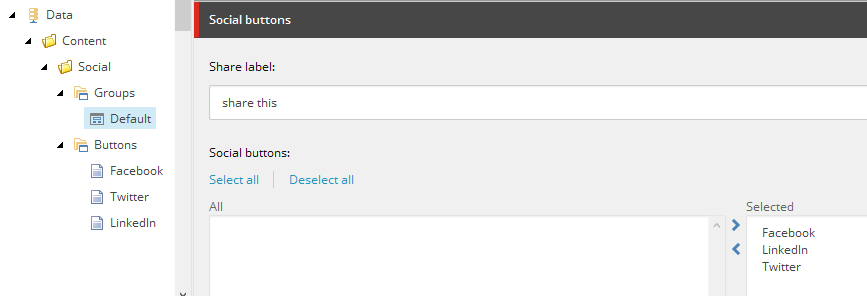 So now, under Data folder I can create social buttons and a social share group based on (some of) these buttons. I made just one and called it Default.