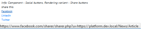 Introduction. Initially, I was going to implement social share buttons on my page. The first thing coming into my mind was to use existing share components coming OOB with SXA. That's what I did and it looked well.. until I viewed generated source. It looks quite monstrous, includes iframes, inline JavaScripts and in general brought customization issues for my front-end developers. Here's how 2 of 3 buttons look like when rendered (3-rd is collapsed):