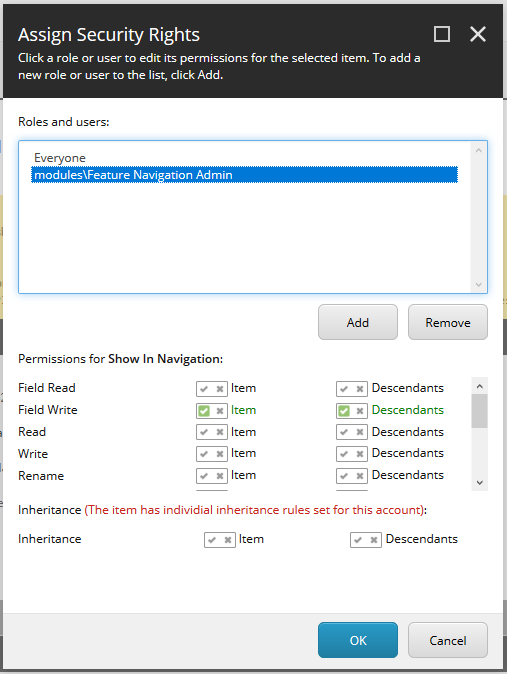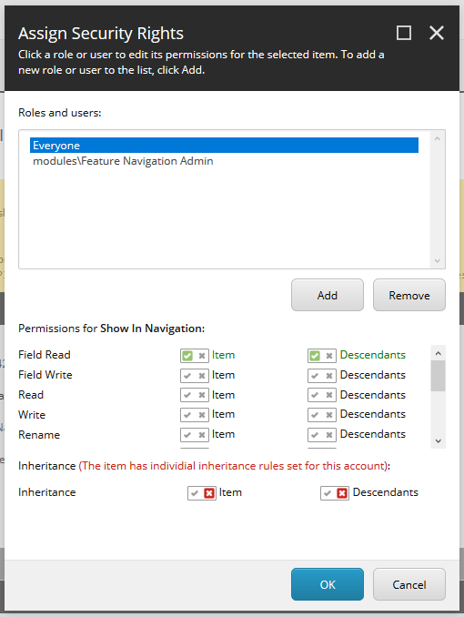 3. Selecting Everyone, remove Inheritance denial for both Item and Descendants by clicking both red crosses, then save (OK).