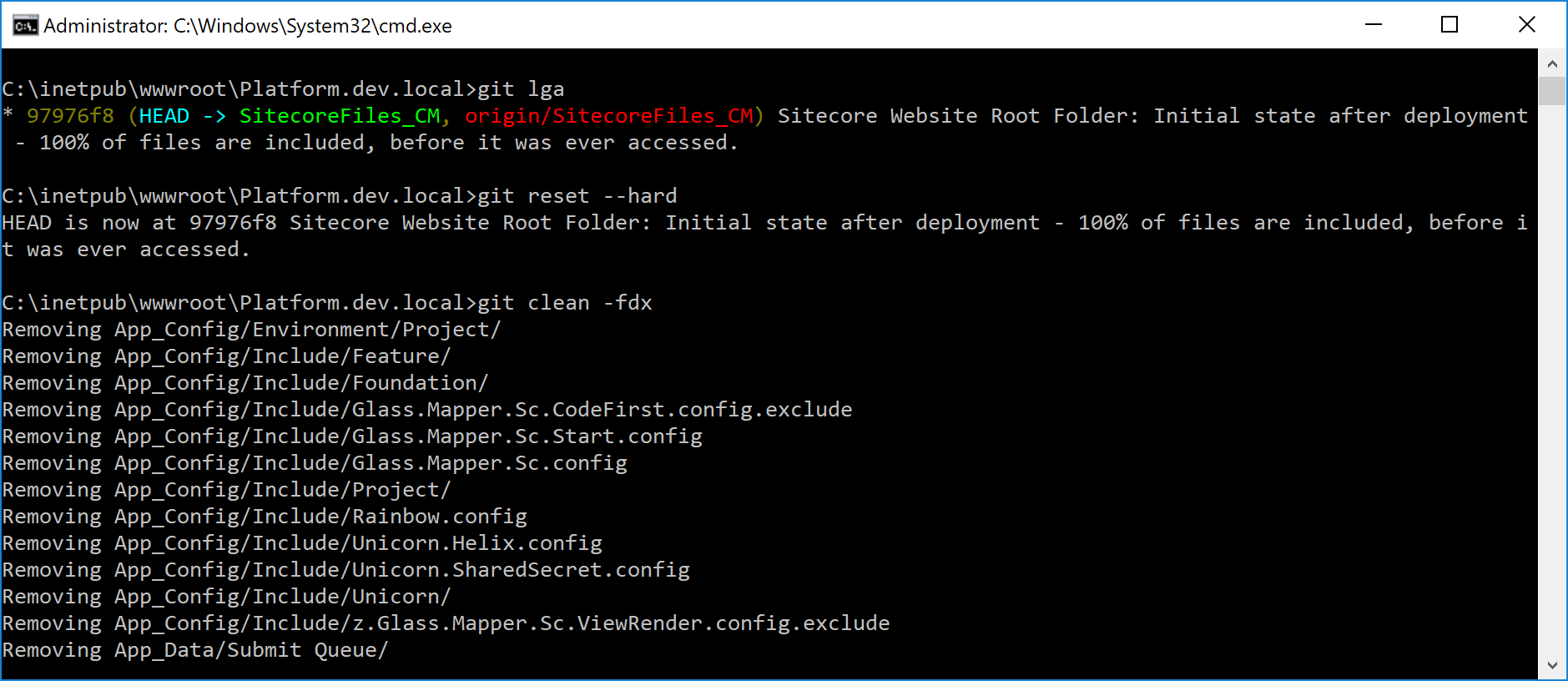The method I am suggesting may be sort of arguably, however, it does the job perfectly, quickly and keeps things consistent and at the same place. What I do - I create an isolated git branch called SitecoreFiles_CM at the same git repository where the main codebase sits, and commit an initial state of Sitecore to that branch. Saying initial I mean exactly the same files as they were installed, before Sitecore was even ever accessed - a clean installation. Of course, not all the files are pushed to remote: things like configurations with my individual (for my local dev instance) passwords do not need to be shared with other developers as well as Sitecore license file. That's why on top of that branch that is pushed to remote, I create one more local commit having these individual settings/changes that I do not push. When I have a need to restore vanilla Sitecore, I navigate to web folder and restore folder to that commit. The next step is git clean command required to get rid of the rest of unversioned files on top of vanilla Sitecore that were deployed from the codebase. As simple, as functional.