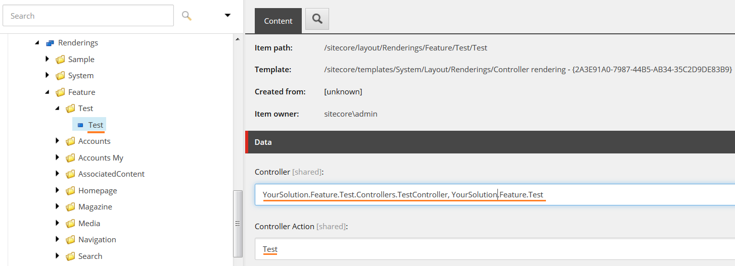 I create a page called Test under website root using one of page templates. Next, a rendering is required to be assigned into a placeholder on a page. I create a controller rendering named Test and put it under this feature folder (also called Test). Please notice, that I have to specify controller with fully qualified name with a name of assembly where this controller resides.