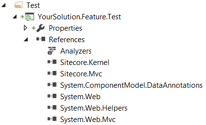 Next, let's create a project structure in Solution Explorer. As we're building a Feature, create a solution folder under Feature folder in Visual Studio and name it Test (as a feature name). Create a class library project within that folder following Helix naming conventions YourSolution.Feature.Test with the same namespace and assembly name. The easiest probably would be simply to copy project folder from an existing feature and change namespace / types there.
