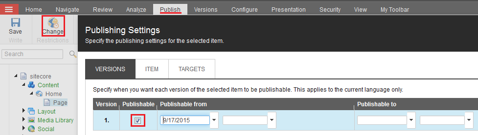 2. If previous step dodn't help, find out is the item publishable at all? Check item's Publishing Restrictions. You may check that clicking Change button from Publish ribbon in Sitecore. Please find official documentation by this link, as it may be helpful to understand what Publishing Restrictions are and how they work; also there's another great article by John West about those restrictions. Ensure that your item either doesn't have time limit frames, or falls within them.