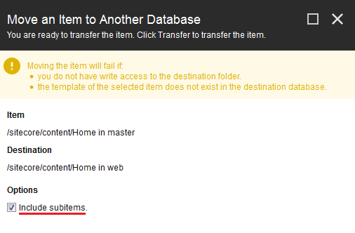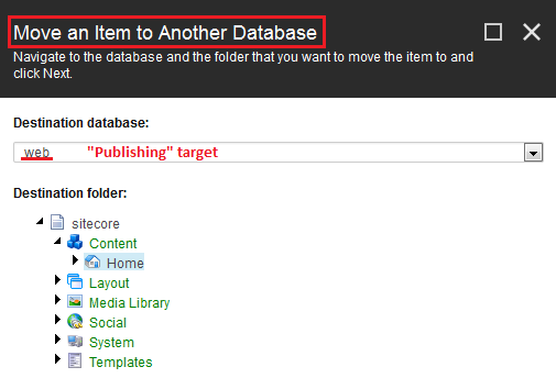 Finally, (remember, I said no panic in the beginning), there is a buletproof solution as the last resort - copy items between databases manually. Go to Control Panel --> Database --> Move an item to another database, where you can move items between databases. One thing to mention - do not forget to update caches after you finish copying items to your target environment.