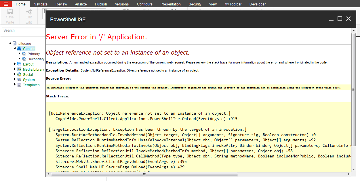 Today I downloaded the latest (v.3.1 for Sitecore 8_001) PowerShell module and decided to play around one concept I hoped to push forward. But unfortunately, as soon as I opened ISE window, I got a NullReferenceException.