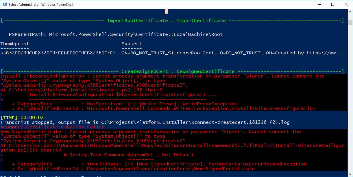 Install-SitecoreConfiguration : Cannot process argument transformation on parameter 'Signer'. Cannot convert the "System.Object[]" value of type "System.Object[]" to type "System.Security.Cryptography.X509Certificates.X509Certificate2".