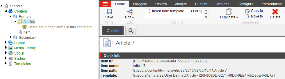 So, as soon we have updated Standard Values with Bucketable checked, we try to create another article (of the same template, for sure), we logically call it Article 7. Once created, Article 7 is already bucketable by its Standard Values and is immediately stored in the bucket. There's no need to perform Sync! It also preloads content area right hand side (or you may search for it from Search tab) and if you pay attention to an Item path field - it is being located exactly as specified in (default in our example) bucketing configuration: