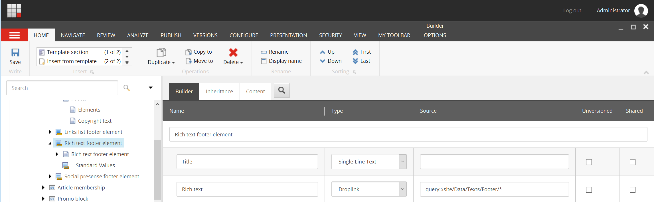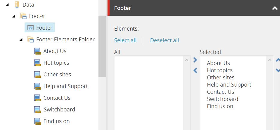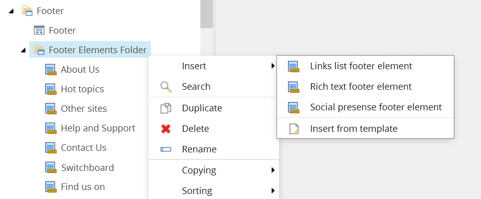 6. Insert Options to be configured for Footer folder to accept both Footer items and Footer Elements Folder. Configure Footer Elements Folder to accept these 3 types. Now one can insert the data. Once done, that will be how the data folder looks like: