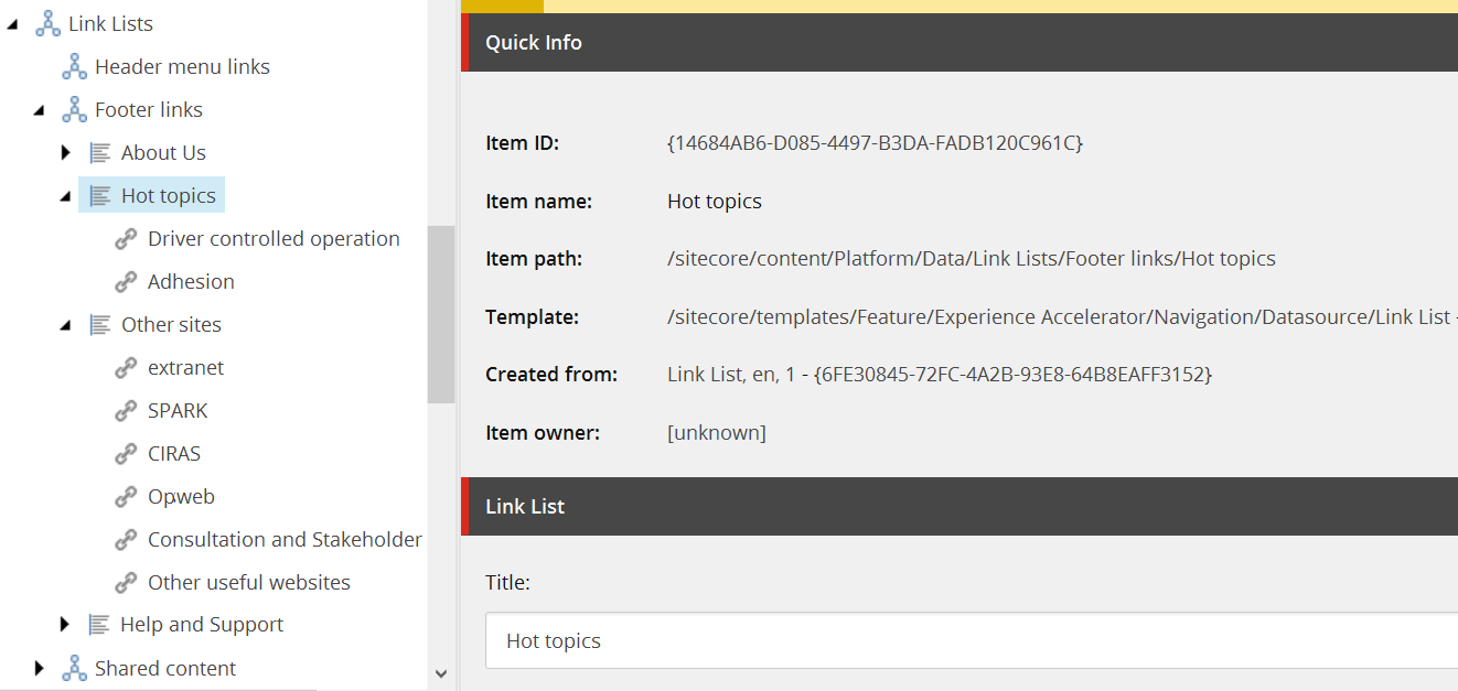 First 4 items (About Us, Hot topics, Other sites, Help and Support) reference corresponding Link Lists as defined as below: