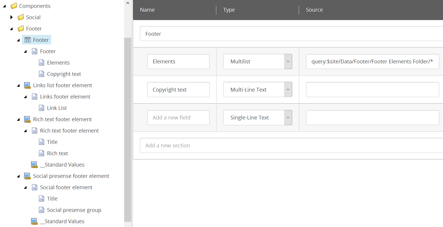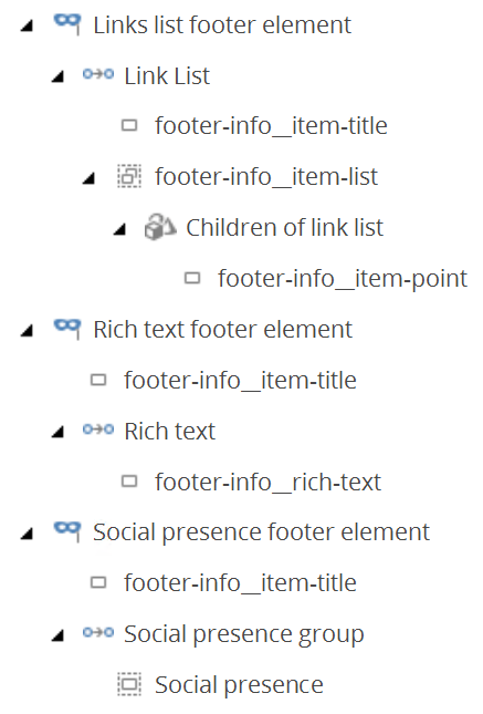What is important to explain here - Elements field is pointing to Footer Elements Folder. At a first glance, that folder contains just a collection of link lists. But that's not right! There are at least 3 types of footer blocks: first four blocks are indeed Link List blocks,however,followed by Rich Text blocks, and finally, there is Social Presence block and all three can be added intoFooter Elements Folder. These three types are defined along with Footer template, you may see on the screenshots below.