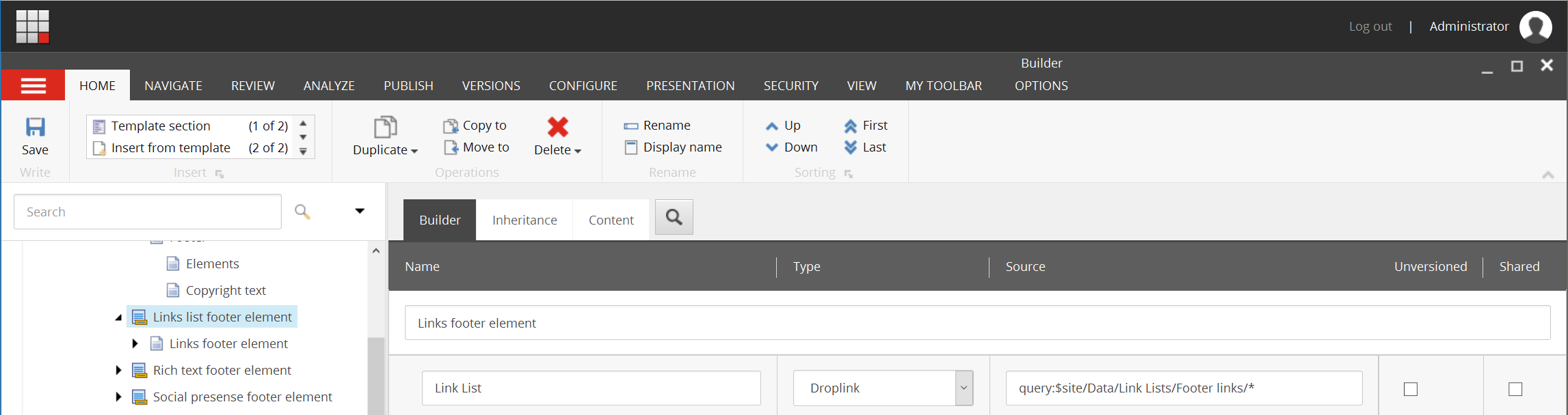 Link list footer element switches to a referenced Link List item and uses Query variant field to iterate its children.